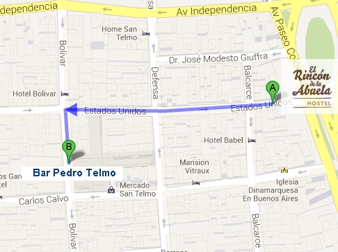 Para llegar al Bar Pedro Telmo desde el hostel a pie es sencillo, ya que hay que caminar aproximadamente 350 metros en tan sólo 4 o 5 minutos. Inicialmente caminamos al oeste por Estados Unidos hacia Bolivar, una vez allí giramos a la izquierda por Bolivar y caminamos hasta llegar a Bolivar 962.